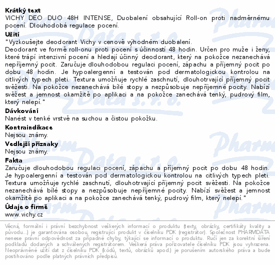 VICHY DEO DUO 48H INTENSE, Duobalení obsahující Roll-on proti nadměrnému pocení. Dlouhodobá regulace pocení.