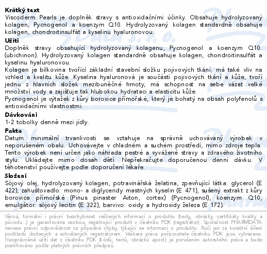 Viscoderm Pearls je doplněk stravy s antioxidačními účinky. Obsahuje hydrolyzovaný kolagen, Pycnogenol a koenzym Q10. Hydrolyzovaný kolagen standardně obsahuje kolagen, chondroitinsulfát a kyselinu hyaluronovou.