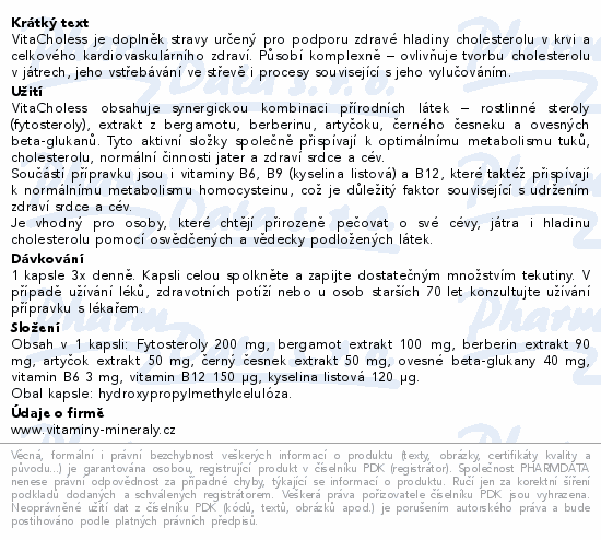 VitaCholess je doplněk stravy určený pro podporu zdravé hladiny cholesterolu v krvi a celkového kardiovaskulárního zdraví. Působí komplexně – ovlivňuje tvorbu cholesterolu v játrech, jeho vstřebávání ve střevě i procesy související s jeho vylučováním.