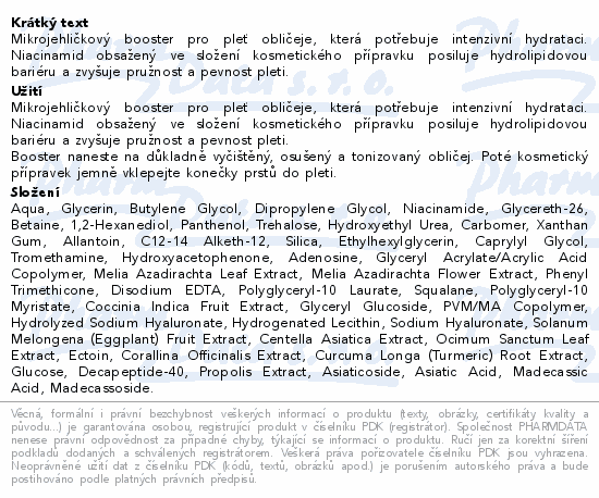 Mikrojehličkový booster pro pleť obličeje, která potřebuje intenzivní hydrataci. Niacinamid obsažený ve složení kosmetického přípravku posiluje hydrolipidovou bariéru a zvyšuje pružnost a pevnost pleti.