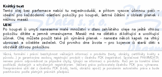 Tento olej bez parfemace nabízí tu nejjednodušší, a přitom vysoce účinnou péči – ideální pro každodenní ošetření pokožky po koupeli, šetrné čištění v oblasti plenek i něžnou masáž.