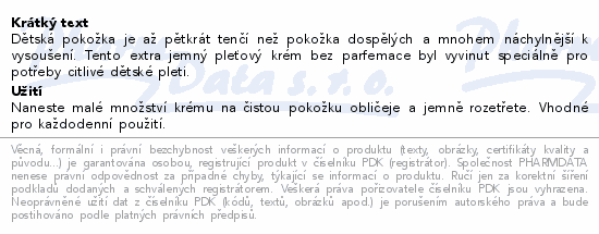 Dětská pokožka je až pětkrát tenčí než pokožka dospělých a mnohem náchylnější k vysoušení. Tento extra jemný pleťový krém bez parfemace byl vyvinut speciálně pro potřeby citlivé dětské pleti.