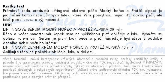 Prémiová řada produktů Liftingové pleťové péče Modrý hořec a Protěž alpská je jedinečná kombinace účinných látek, které Vám poskytnou nejen liftingovou péči, ale také pocit luxusu a výjimečnosti.