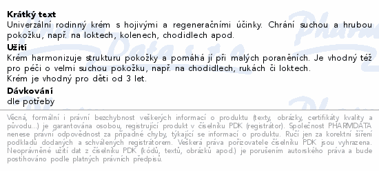 Univerzální rodinný krém s hojivými a regeneračními účinky. Chrání suchou a hrubou pokožku, např. na loktech, kolenech, chodidlech apod.