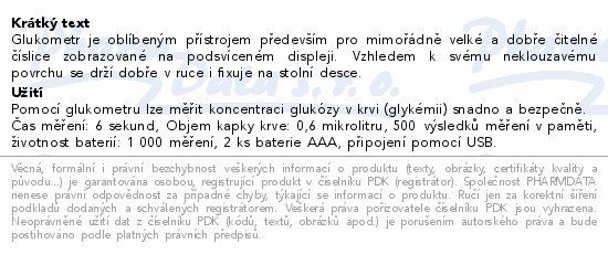 Glukometr je oblíbeným přístrojem především pro mimořádně velké a dobře čitelné číslice zobrazované na podsvíceném displeji. Vzhledem k svému neklouzavému povrchu se drží dobře v ruce i fixuje na stolní desce.