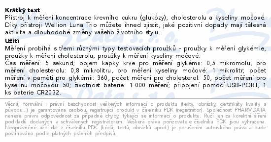 Wellion LUNA trio - krevní glukóza, cholesterol a kyselina močová Vám umožňuje získat přesné, na plazmu kalibrované výsledky,...