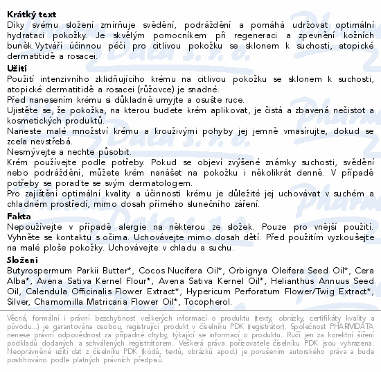 Díky svému složení zmírňuje svědění, podráždění a pomáhá udržovat optimální hydrataci pokožky. Je skvělým pomocníkem při regeneraci a zpevnění kožních buněk.Vytváří účinnou péči pro citlivou pokožku se sklonem k suchosti, atopické dermatitidě a rosacei.