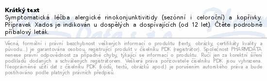 Symptomatická léčba alergické rinokonjunktivitidy (sezónní i celoroční) a kopřivky. Přípravek Xados je indikován u dospělých a dospívajících (od 12 let). Čtěte pozorně příbalový leták.