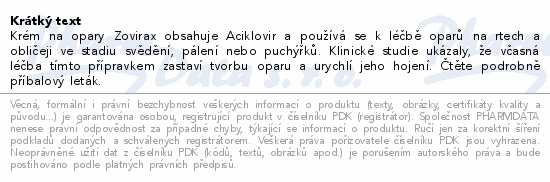 Krém na opary Zovirax obsahuje Aciklovir a používá se k léčbě oparů na rtech a obličeji ve stadiu svědění, pálení nebo puchýřků. Klinické studie ukázaly, že včasná léčba tímto přípravkem zastaví tvorbu oparu a urychlí jeho hojení. Čtěte pozorně příbalový leták.