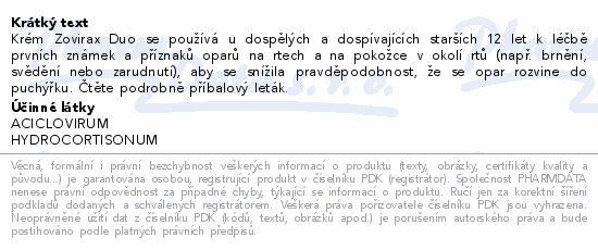 Krém Zovirax Duo se používá u dospělých a dospívajících starších 12 let k léčbě prvních známek a příznaků oparů na rtech a na pokožce v okolí rtů (např. brnění, svědění nebo zarudnutí), aby se snížila pravděpodobnost, že se opar rozvine do puchýřku. Čtěte pozorně příbalový leták.